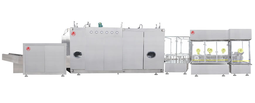 本機組符合“cGMP”要(yào)求,適用於西林瓶的清洗、烘幹滅(miè)菌、無菌灌裝及加塞,由CLQ-C型鏈式超聲波清洗機、KSM型玻璃瓶隧道式滅菌幹燥機、GGZ型高速液體灌(guàn)裝(zhuāng)壓塞機組成。