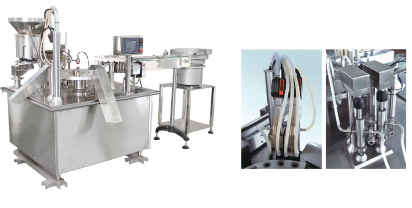 本機組符合“cGMP”要求,適用於新(xīn)型易折塑料瓶的灌裝(zhuāng)與熱封口,是參照國外同類機型(xíng)更新設計而成。 本機通過自動上瓶、底部灌裝、自動上蓋、熱熔式底部封口、機械手送出瓶等一(yī)係列特製工序後完(wán)成灌封 工作,是國內口服液灌(guàn)裝生產的理想設備。